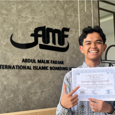 MALANG – Santri Pondok Pesantren Internasional Abdul Malik Fadjar (PPI AMF), Muhammad Kuffih Taqiyyudin berhasil mendapatkan predikat best position paper